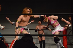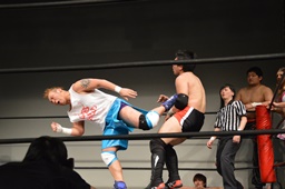 HIROKI首投げからフラッシングエルボー(左写真)、カウント2。マルテロにタッチ。5分経過。