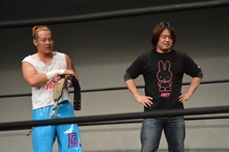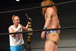 HIROKI「これはタッグベルトなんだよ。お前のパートナーは誰だよ?」(左写真)