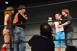 HIROKIのドロップキックが福田に誤爆したことから小競り合い。テイオーが仲裁(右写真)。