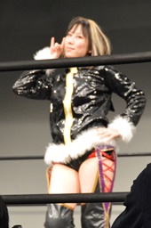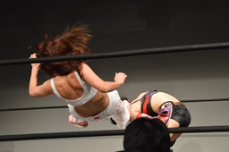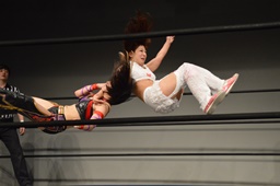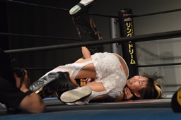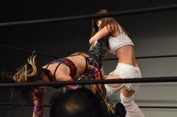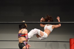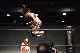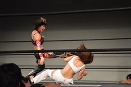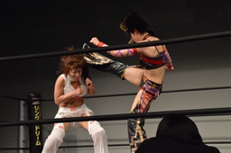 チェリー美央の腕取って後ろ足で顔面蹴り上げ、ロープに飛んでドロップキック(左写真)。