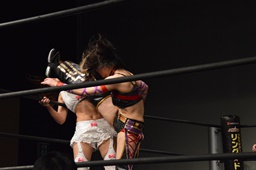 美央バズソーキック、カウント2。ダブルアームはチェリーブロックしてブリザード(左写真)、