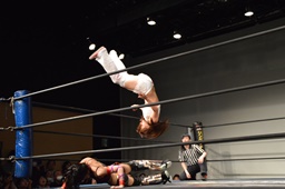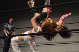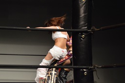 リリースするとコーナーに上ってミサイルキック(右写真)、カウント2。