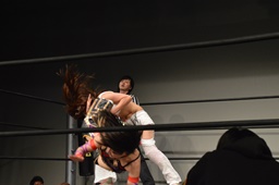 フライングネックブリーカードロップ(右写真)、どっこいしょ、カウント2。
