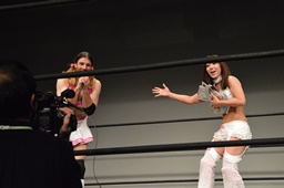 ビアードがリングに飛び込んできたので挑戦?と思ったら「もっと女子部と闘いたい」ということで5月18日の後楽園大会に女子の「友達」を連れて来る、と宣言(左写真)。