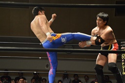 佐藤ロープに振る、FUMAブロック。佐藤ロープに飛ぶ、FUMA低空ドロップキック、サッカーボールキック(右写真)。