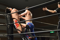 FUMAブレーンバスター狙う、佐藤はワキ固めに切り返そうとするがFUMAヒザ蹴り入れてブレーンバスター(左写真)。佐藤場外エスケープ。