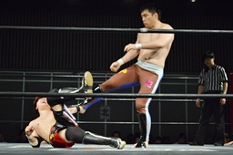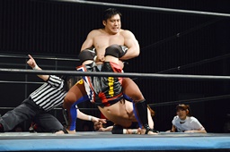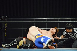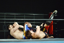 佐藤ヒザ蹴り、ミドルキック、ボディスラムから逆エビ固め(右写真)、風戸ロープ。5分経過。