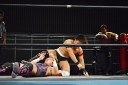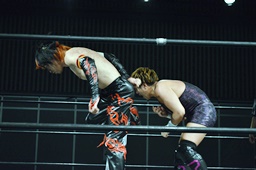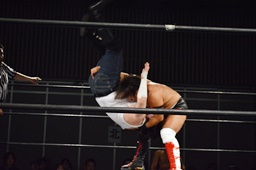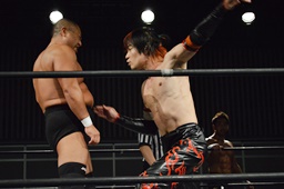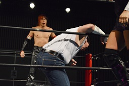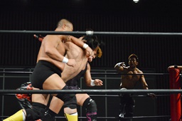 V1アームロック(右写真)、イサミロープ。木原は今成にタッチ。今成ダブルアックスハンドル、イサミ腕を取ってひねる、今成ロープ。10分経過。