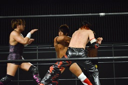 イサミも入って蹴り上げる(左写真)、ロープに飛ぶ、
