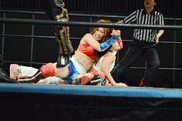 チェリーダブルリストアームサルト狙う、美央ブロック、チェリー腹パン入れてダブルリストアームサルト(左写真)、カウント2。