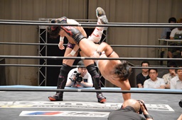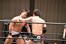 冨永ヒザ蹴り、ロープに飛ぶ、三富カウンターの逆水平(右写真)。