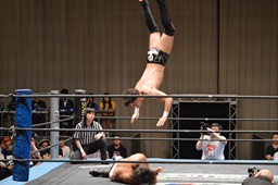 冨永ボディスラムからコーナーに上ってムーンサルトプレス(左写真)、