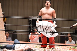 リングに戻すと石川はガンプロの旗を持ってくると(右写真)大家の上に広げ(右写真)、ジャイアントプレス?狙ってコーナーに上る、
