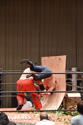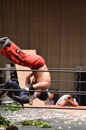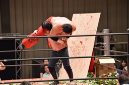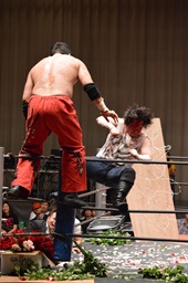 有刺鉄線ボードの上にボディスラム狙うが石川ブロック、逆にボディスラム(右写真)。