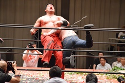 大家再度コーナーに上るエルボー連打、雪崩式ブレーンバスターに(右写真)。