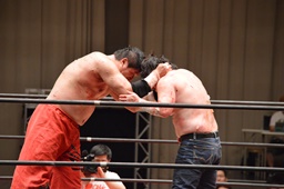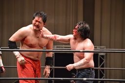 石川「大家!お前にあった個人的な憎しみは今日の試合で思い切り出させてもらいましたよ。本当だったら今日、俺が勝ったら大家健にユニオンに戻ってこいって言うつもりでした。でもこの間、ガンプロに上がった時、誰よりも頑張っている、そして強くなっている大家健を見て、大家健にはガンプロが合っていると思いました。だから今日はイチレスラーとしての石川修司と大家健としてやらせてもらいました。だからこれで終わりとは言わねえよ。もっともっとユニオンとガンプロを大きくして、またやりましょう。」(左写真)