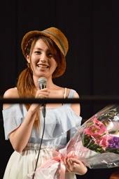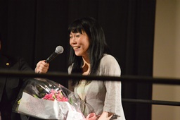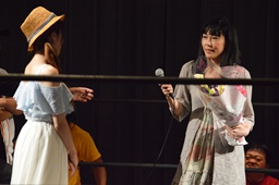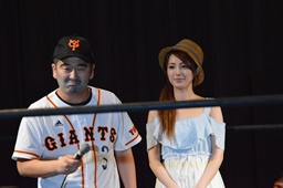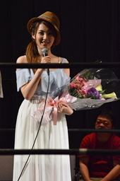 スーザン代表が花束持ってリングに(左写真)。