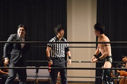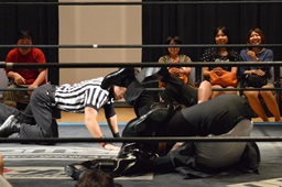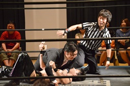 カバー(右写真)、今日ユニオン初レフェリーの吉野恵悟は円華が持ってる金を見てカウント止める。
