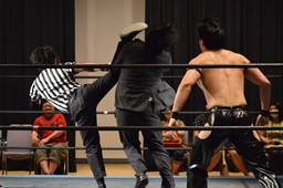 吉野レフェリーが鮮やかなトラースキック(右写真)、