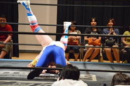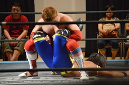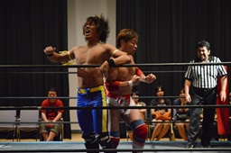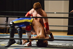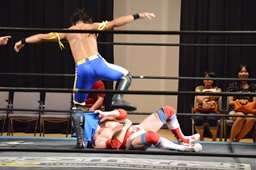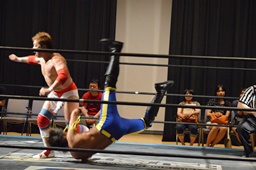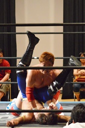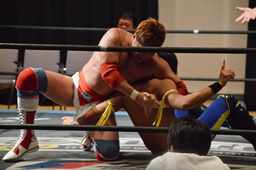 河村ノーザン狙う、テイオーブロック、河村逆さ押さえ込み(右写真)、カウント2。