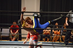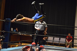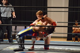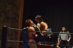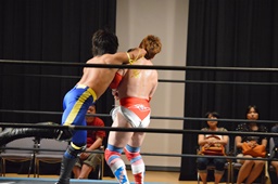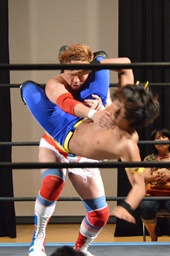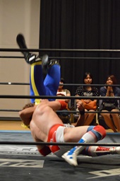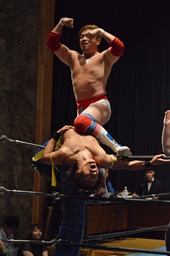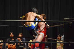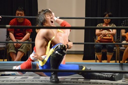 テイオー切り返してチョークスラムから元祖テイオーロック(右写真)、河村ロープ。5分経過。