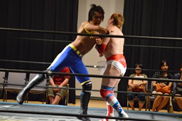 ボディスラムから逆エビ固め(右写真)、河村ロープ。
