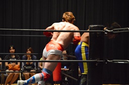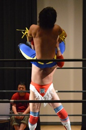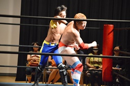 テイオー河村をコーナーに追い込んで背中にエルボー(右写真)。