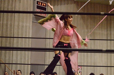 コーナーに上ってミサイルキック(左写真)、カウント2。ビアード呼び込んでダブルのミドルキック、カバー、チェリーがカット。10分経過。