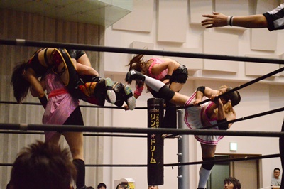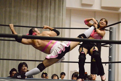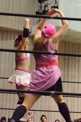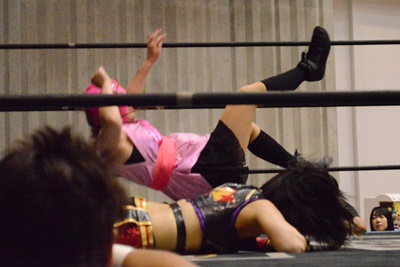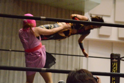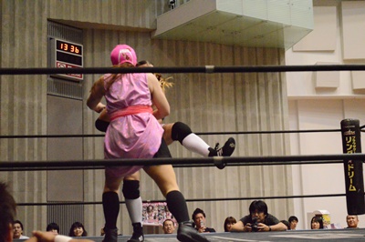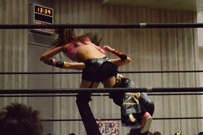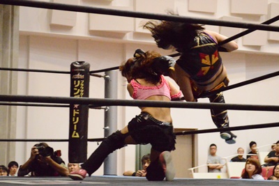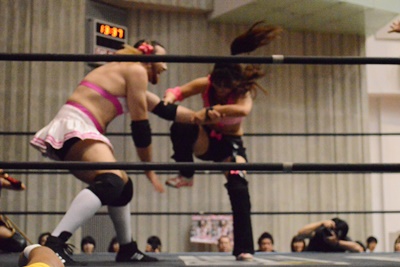 チェリーと美央手四つから力比べ、美央ブレーク、チェリーキック、ロープに飛んで顔面ドロップキック(左写真)。
