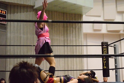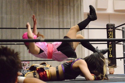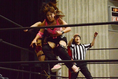 チェリーロープに振る、美央切り返すがチェリーはフライングネックブリーカードロップ(左写真)、初日の出にタッチ。