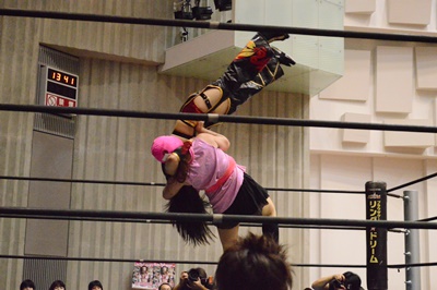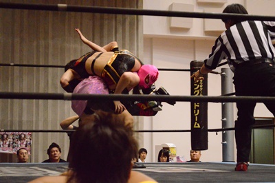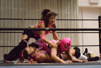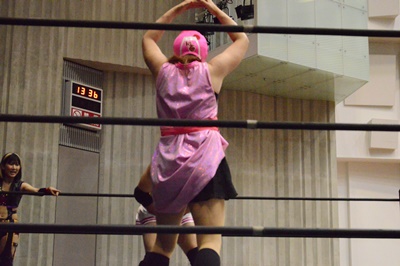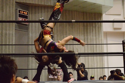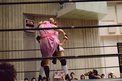 チェリーチョーク攻撃で形勢逆転、ダブルリストアームサルト(右写真)、カウント2。