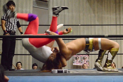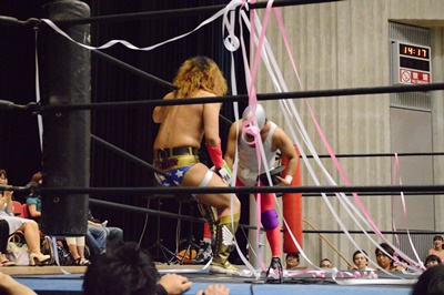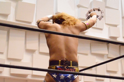 福田はタンバリンを持ってアックスボンバー(右写真)、カバーするがカウント2で引き起こす。