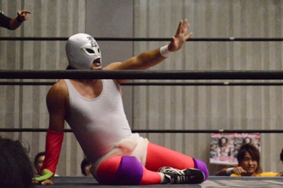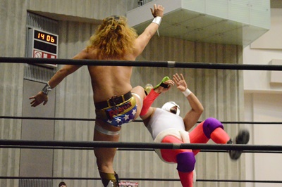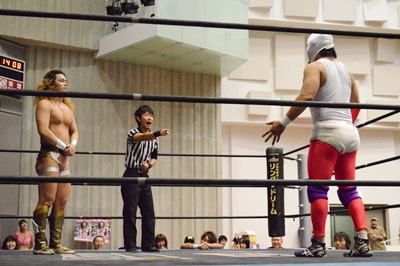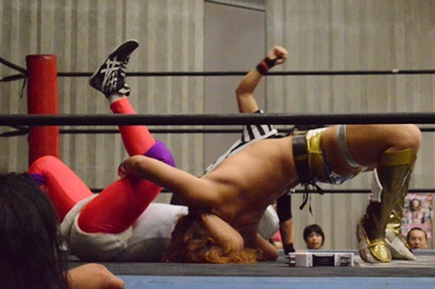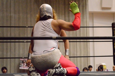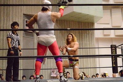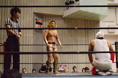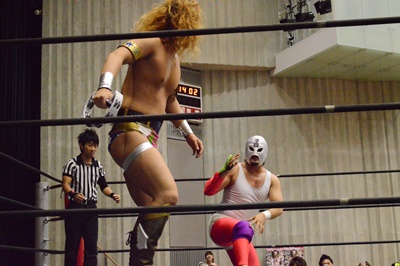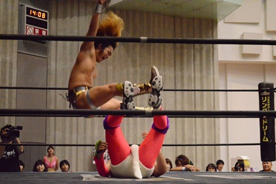 平日「ただし、丸め込みとかはしないでくれ。得意のレッグドロップで止めを刺してくれ。」(右写真)