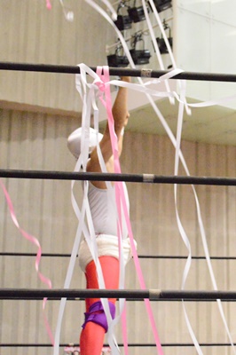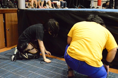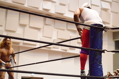 福田がロープをまたぐ、平日がコーナーに上ってロープを引き上げる(右写真)