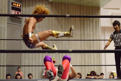 福田ロープに飛んでレッグドロップ(右写真)、カバー、