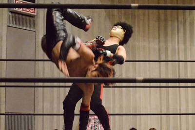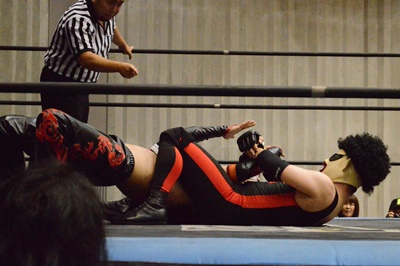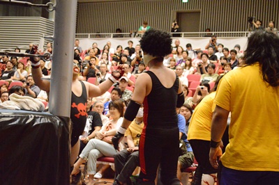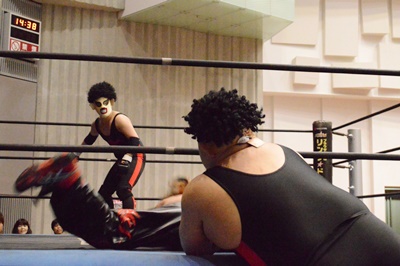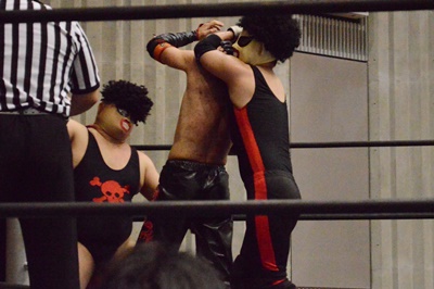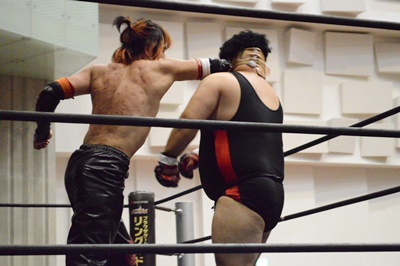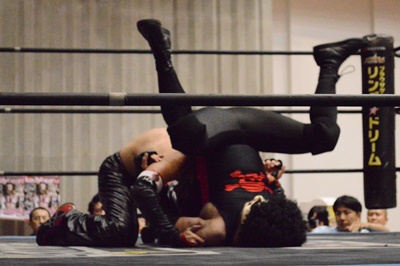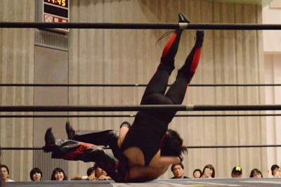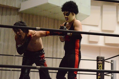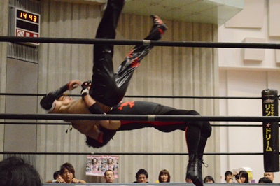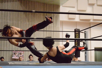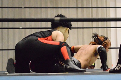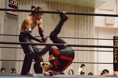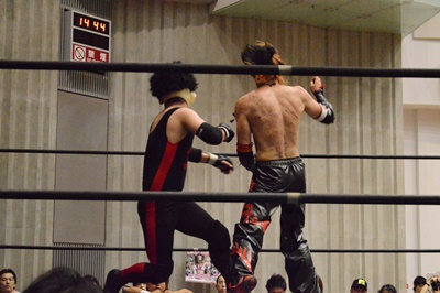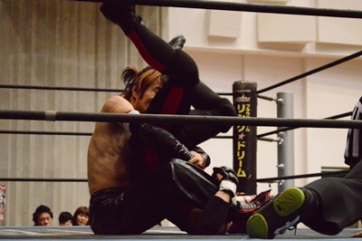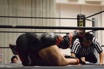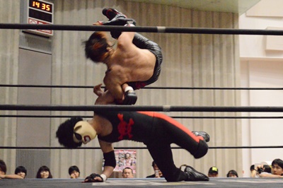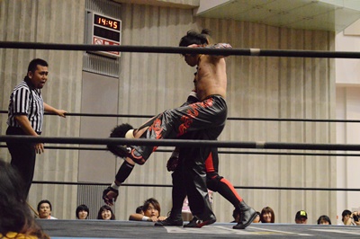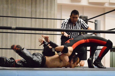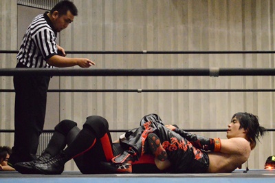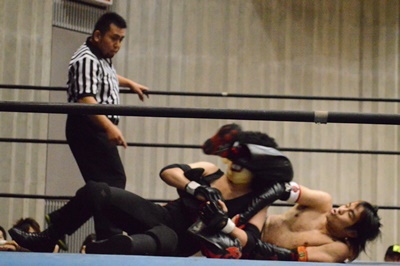 ゴローJrタックル(右写真)、イサミブロック、ゴローJケサ固めから片エビ固め、カウント2。