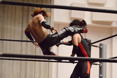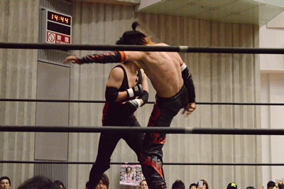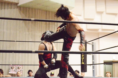 ゴローJrヘッドロック、イサミロープに振る、ショルダーブロックの打ち合いからイサミドロップキック(左写真)。