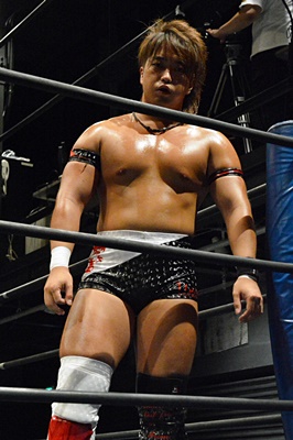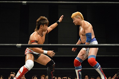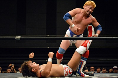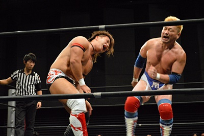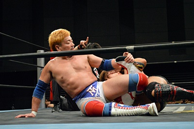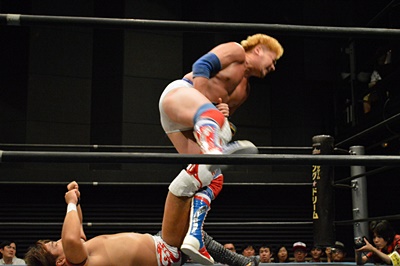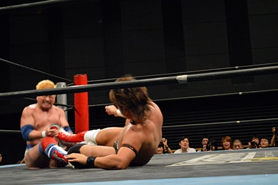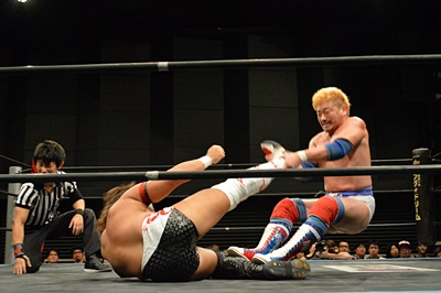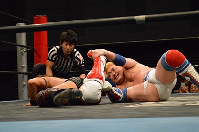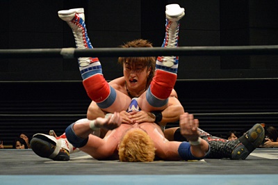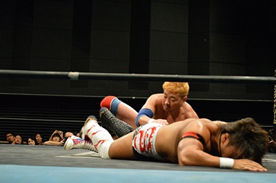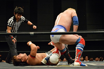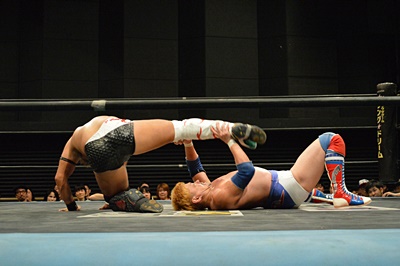テイオーブレーンバスター狙う、三富着地してコブラツイスト(左写真)、