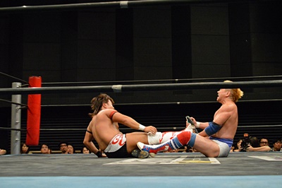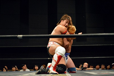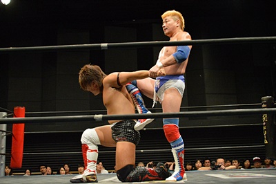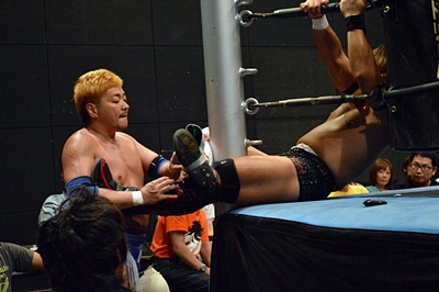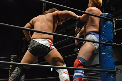 ロックアップ、テイオーヘッドロック、三富ロープに振る、テイオーショルダーブロック。テイオーロープに飛ぶ、三富ヒップトス狙うがテイオーはコブラツイストに(右写真)。三富強引に外してヒップトス。