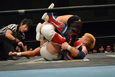 三富力で切り返しヘッドロック(右写真)からフライングメイヤー、