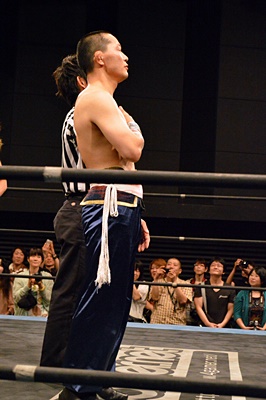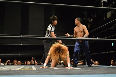 趙雲手を使わずに吉野レフェリーを起こす(左写真)。