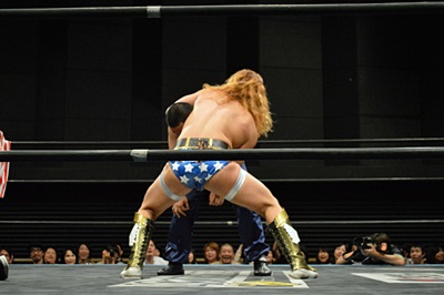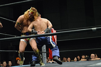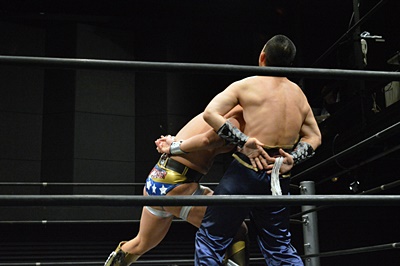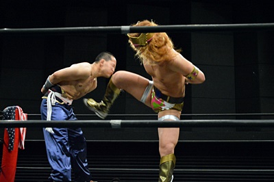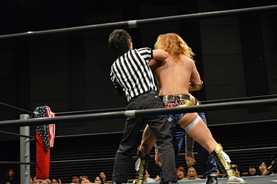 吉野レフェリーを突き倒しパーフェクトプレックスの体勢(左写真)、趙雲ブレーク。