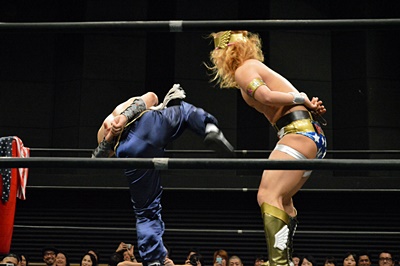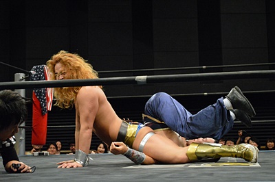 吉野レフェリーが復活すると外道クラッチ(左写真)、カウント3。