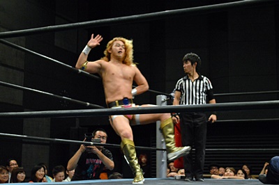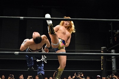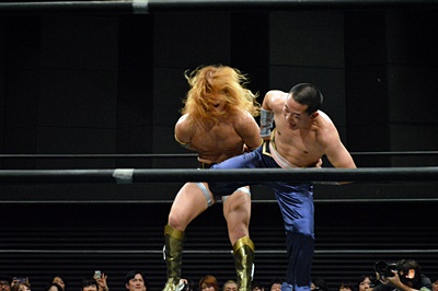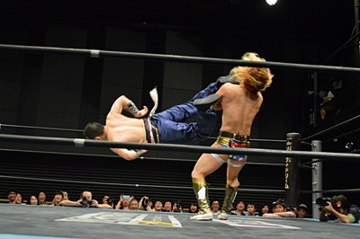 福田吉野レフェリーの見てないスキにアックスボンバー(右写真)、