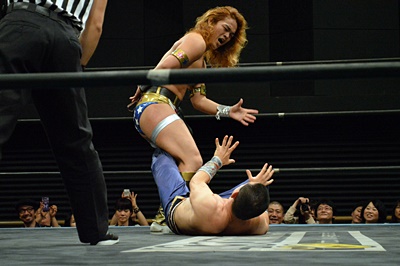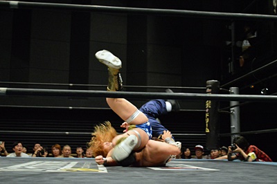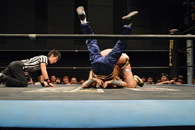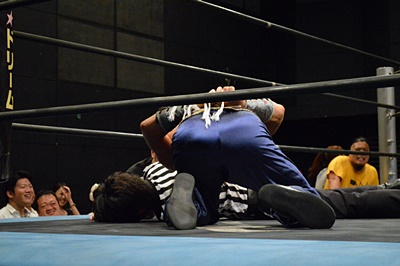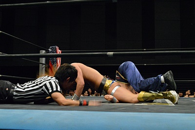 腕を使わず脚だけでオクラホマロールのように丸め込む(右写真)、しかし吉野レフェリーダウンしたままでカウントが入らない。