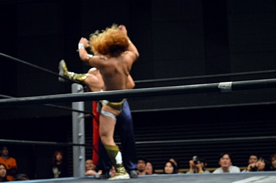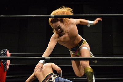 コーナーに上ってミサイルキック(左写真)。