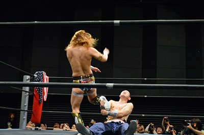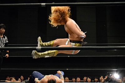 レッグドロップ(左写真)、カウント2。