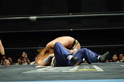 福田手を使えないので頭で押さえ込む(右写真)、カウント2。