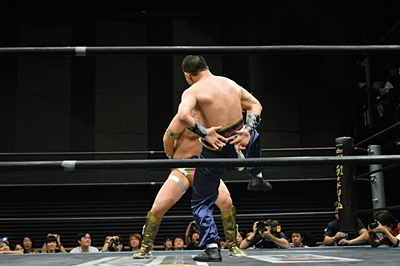 押さえ込む(左写真)、カウント2。福田トーホールド、趙雲今度は顔でエスケープ。5分経過。