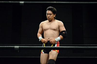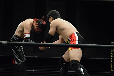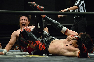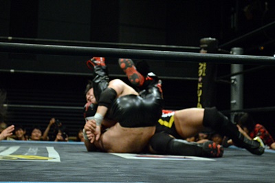 FUMA切り返してアームロックに、イサミはブリッジで耐える(右写真)、ロープエスケープ。